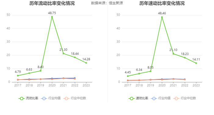 2023年,公司流动比率为14.28,速动比率为14.11。
