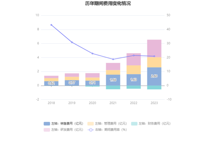 2023年,公司期间费用为6.01亿元,较上年同期增加1.85亿元;但期间费用率为20.93%,较上年同期下降0.53个百分点。其中,销售费用同比增长60.03%,管理费用同比增长15.02%,研发费用同比增长44.49%,财务费用由去年同期的-4522.02万元变为-5419.04万元。