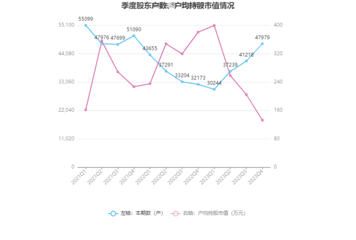 筹码集中度方面,截至2023年年末,公司股东总户数为4.8万户,较三季度末增长了6761户,增幅16.40%;户均持股市值由三季度末的204.86万元下降至132.73万元,降幅为35.21%。