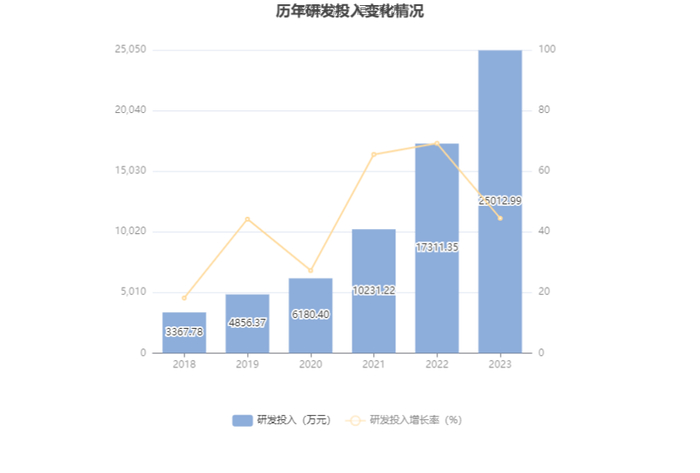 2023年全年,公司研发投入金额为2.50亿元,同比增长44.49%;研发投入占营业收入比例为8.72%,相比上年同期下降0.21个百分点。此外,公司全年研发投入资本化率为0。