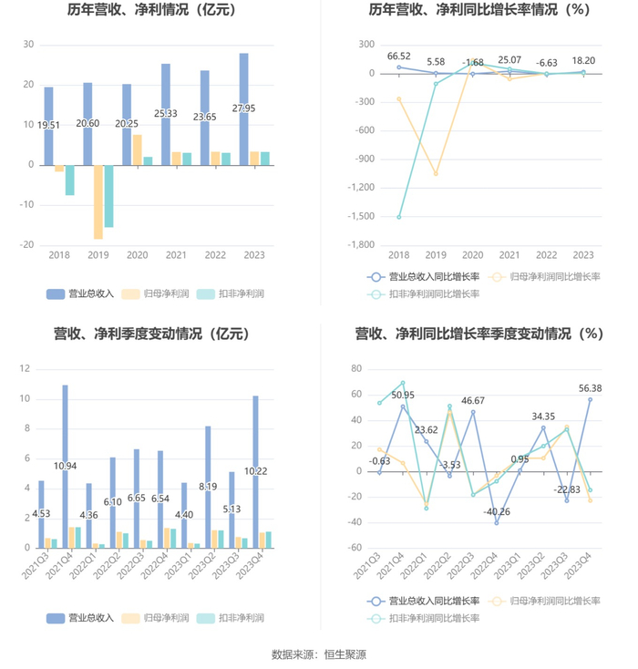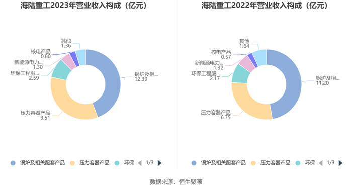 海陆重工(002255)3月20日披露2023年年报。2023年,公司实现营业总收入27.95亿元,同比增长18.20%;归母净利润3.40亿元,同比增长1.08%;扣非净利润3.32亿元,同比增长6.77%;经营活动产生的现金流量净额为3.23亿元,同比下降35.19%;报告期内,海陆重工基本每股收益为0.404元,加权平均净资产收益率为9.67%,已连续三年下降。