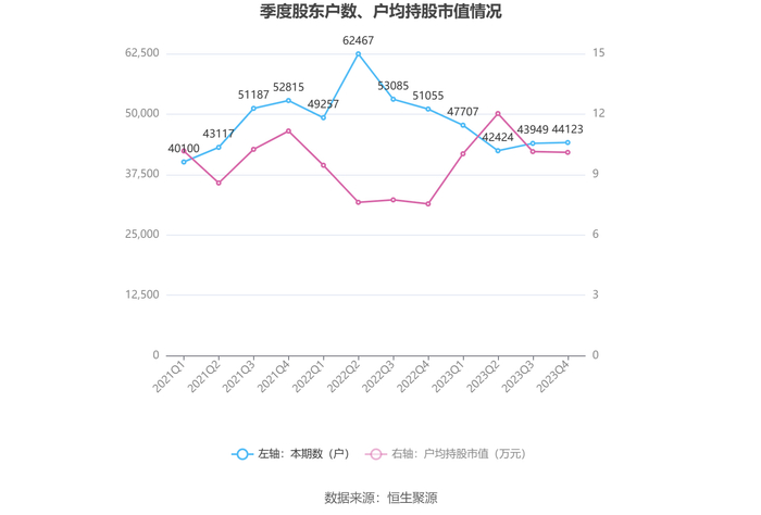 筹码集中度方面,截至2023年年末,公司股东总户数为4.41万户,较三季度末增长了174户,增幅0.40%;户均持股市值由三季度末的10.14万元下降至10.10万元,降幅为0.39%。