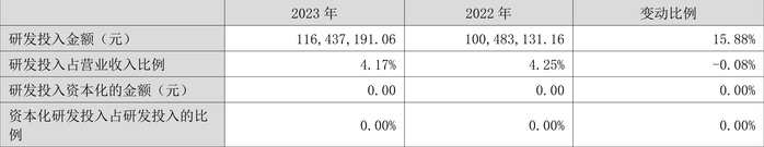 2023年全年,公司研发投入金额为1.16亿元,同比增长15.88%;研发投入占营业收入比例为4.17%,相比上年同期下降0.08个百分点。此外,公司全年研发投入资本化率为0。