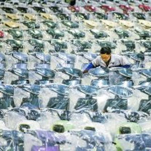 2024年1月19日,浙江温岭新河镇一电动自行车企业生产车间内,工人在对即将出厂的车辆进行检测。