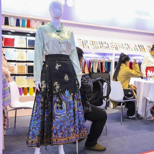 和赵悦相似,在浙江柯桥经营着一家布店的老何正忙着接待来自全国各地的客人。他发现,马面裙热潮之下,越来越多的厂商在选择布料时开始倾向于更具中式元素的图案及颜色。一番打听后得知,原来对方不再只满足于马面裙及汉服的设计生产,逐渐涉足具有国风元素的中式服饰。