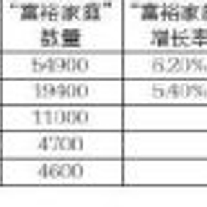 胡润报告显示,陕西600万元资产“富裕家庭”数量54900户,比上年增长3200户;拥有千万资产的“高净值家庭”数量20900户,比上年增长800户;拥有亿元资产的“超高净值家庭”数量1340户,比上年增长20户。