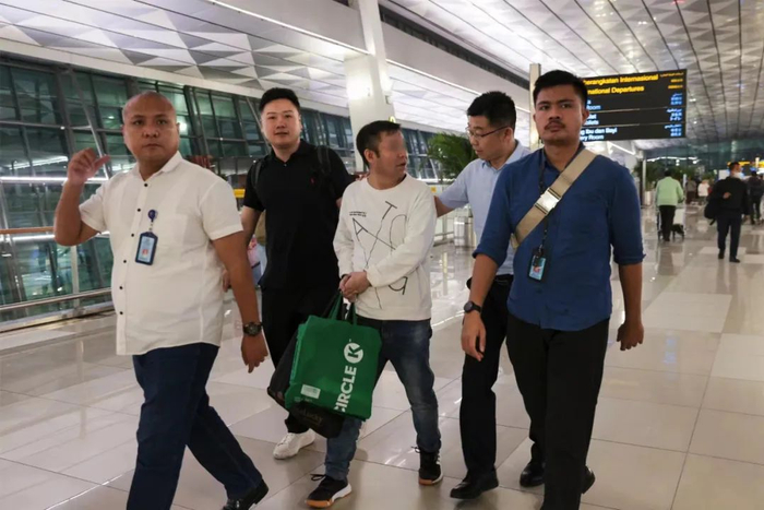 3月13日21时20分,在雅加达苏加诺-哈达国际机场三号航站楼,李文明(右二)和敖拉(左二)接到雅加达北区移民局警员交过来的孙大龙(左三)。