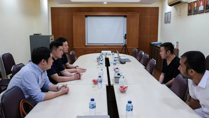 3月13日21时33分,在雅加达苏加诺-哈达国际机场三号航站楼,李文明(左二)和雅加达北区移民局警员(右一)商议移交细节。