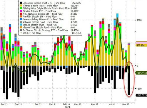 市场分析公司VettaFi的研究主管Todd Rosenbluth表示,“作为当前规模最大、价格最高的比特币ETF产品,GBTC出现大量获利了结和赎回是可以理解的。”他还指出,“资金不会日复一日地涌入这些ETF,人们在价格强劲运行后获利了结是合理的。”