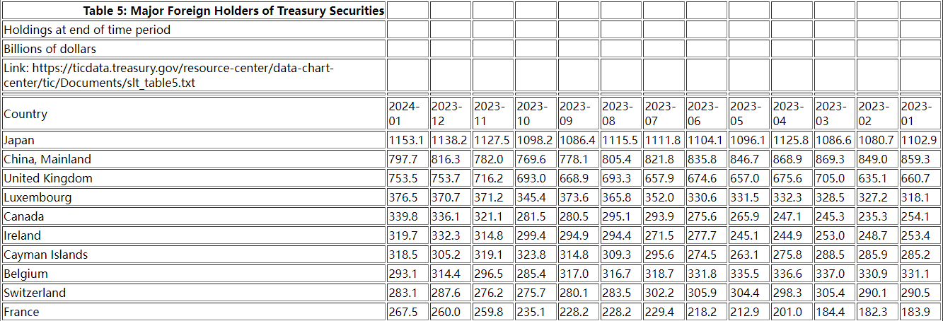 2024年开年:中国美债持仓重回8000亿美元以下 日本“四连增”