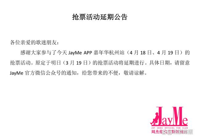 “JayMe”方面通过官方微信表示,原定于3月19日的周杰伦杭州站演唱会抢票活动将延期进行。而在此前,该平台工作人员告诉北京商报记者,杭州场的抢票将进行4轮,首轮放票100张。