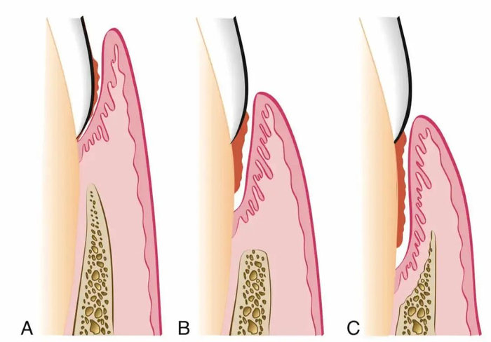 此外,牙科修复体,比如填充物、冠、桥或贴面等不良(如边缘悬突或不密合),也可能促进菌斑形成,从而增加炎症,并可能导致牙龈附着和牙槽骨丢失。