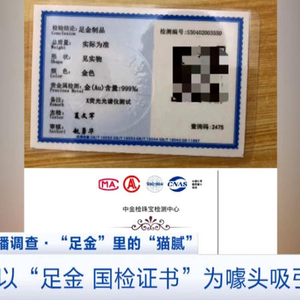 消费者 杨女士:看好了是“999足金”才买的,当时下单是以500元/克的价格买的,有优惠券400多元。他说会自带证书,有一个二维码,他可能以为别人都不会查,我拿回来之后一查,查无此证。问他是真的还是假的,他也不正面回答,让我退回来。