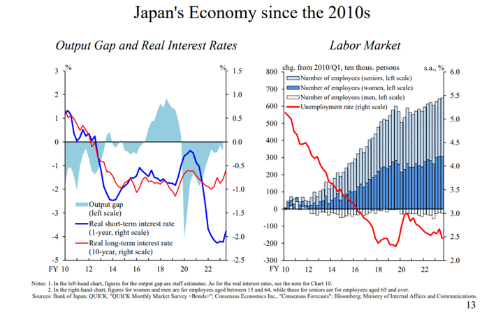 如图13所示,在QQE以及后续的负利率和YCC政策下,日本的短期和长期实际利率均显著为负。尽管自然利率很低,但上述政策创造了相当宽松的融资环境。由此产生的结果是,需求短缺得到解决,失业率大幅下降。