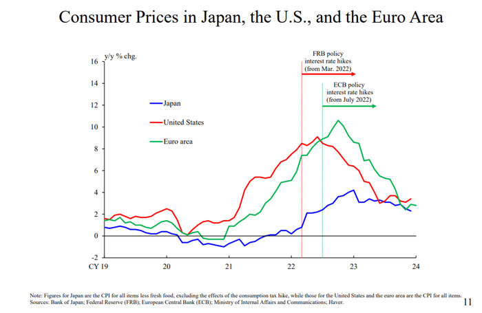 如图11所示,从美国和欧元区的情况来看,美联储和欧央行在2022年开始上调政策利率的时候,其通胀都超过了8%,并引发了破坏市场对通胀中长期实现2%目标的信心的重大风险。日本目前的通胀情况则明显不同。
