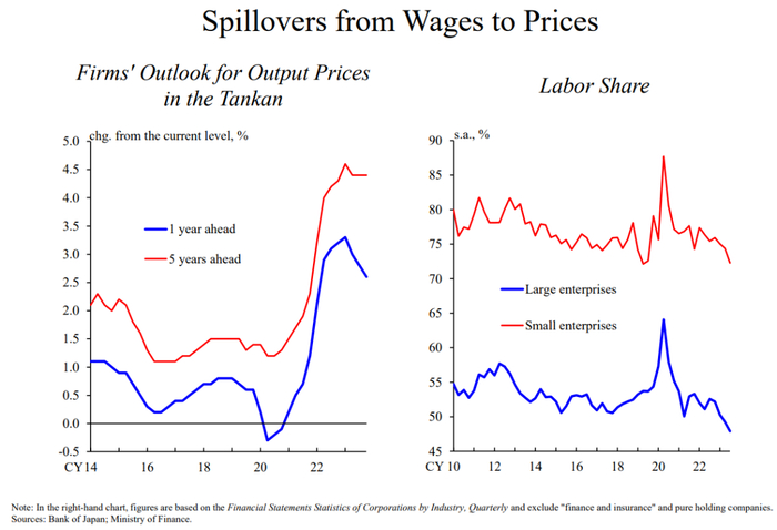 另一方面,据企业反映,与原材料成本不同,劳动力成本的攀升很难转嫁至销售价格。我认为,许多公司确实面临着这种具有挑战性的情况。尽管如此,企业利润处于高位,且劳动收入份额数据表明,至少从宏观经济角度来看,劳动力成本实现了一定程度的转嫁。近期,企业的劳动收入份额有所下降,包括小企业。如果企业根本无法将去年春天的工资增长传导至价格端,其利润就会收缩,劳动收入份额就会增加。我认为这表明情况可能因公司而异,也凸显了企业对企业交易中适当转嫁成本的重要性。