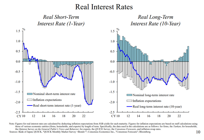 尽管如此,考虑到上文阐述的前景,即使日央行退出负利率政策,也很难想象会继续快速加息。我认为,即使退出负利率政策,我们也会维持宽松的融资环境。如图9所示,目前市场对政策利率路径的预期是非常渐进的。日央行在对政策利率作出假设时,会考虑市场的预期,以明确对经济活动和价格走势的展望。尽管如此,日央行并不认为通胀会显著高于2%。如图10所示,目前,日本的实际利率深陷负区间,融资环境高度宽松。这种情况预计不会有太大变化。