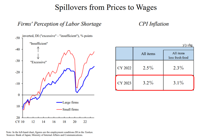 为实现上述前景,我们需要工资和物价之间实现双向的良性循环,包括从价格到工资,以及从工资到价格。对第一个方向来说,问题在于工资是否会随着物价攀升而上涨。在这一点上,从宏观经济环境来看,日本的形势较去年更加有利。如前所述,企业利润一直处于高位,如图6所示,企业面临日益突出的劳动力短缺问题。每年春季工资谈判时,上一年的CPI数据已经出炉,可作参考。2022 年CPI增幅为2.5%;2023 年更高,为3.2%。