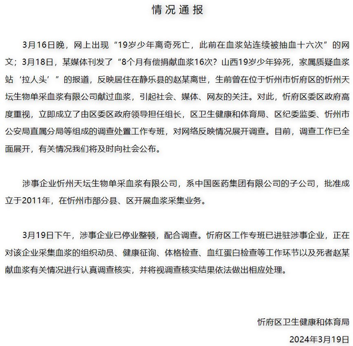 3月19日,山西省忻州市忻府区官方微信号“首善忻府”发布情况通报称,3月16日晚,网上出现“19岁少年离奇死亡,此前在血浆站连续被抽血十六次”的网文;3月18日,某媒体刊发了“8个月有偿捐献血浆16次?山西19岁少年猝死,家属质疑血浆站‘拉人头’”的报道,反映居住在静乐县的赵某离世,生前曾在位于忻州市忻府区的忻州天坛生物单采血浆有限公司献过血浆,引起社会、媒体、网友的关注。