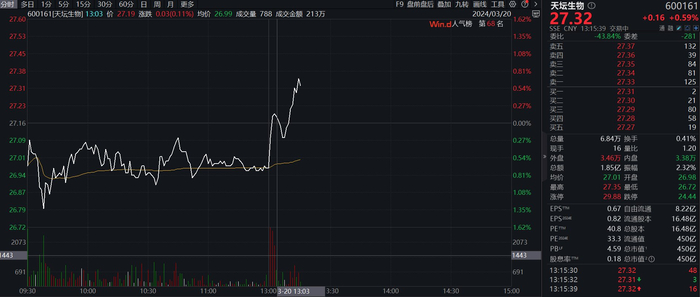 3月20日午后,天坛生物股价短线拉升,截至发稿,由跌转涨0.59%,报27.32元。