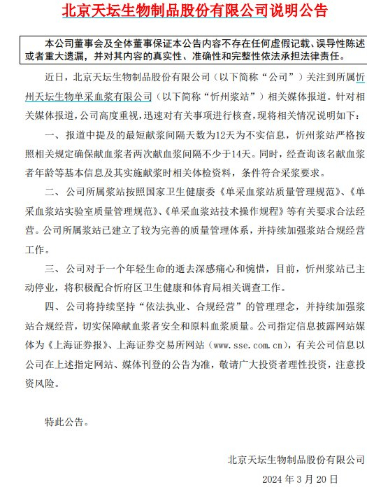 天坛生物今日午间发布公告,近日,公司关注到所属忻州天坛生物单采血浆有限公司(以下简称“忻州浆站”)相关媒体报道。针对相关媒体报道,公司高度重视,迅速对有关事项进行核查,现将相关情况说明如下: