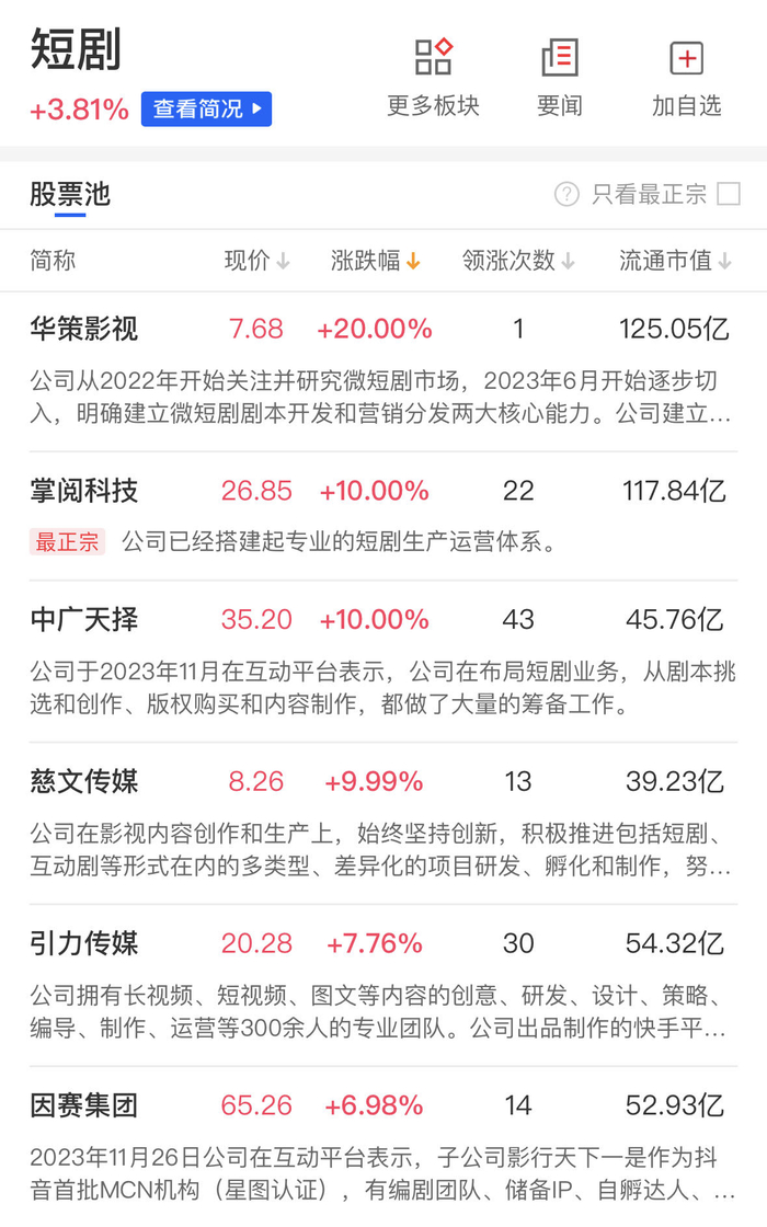 短剧、AIGC等传媒娱乐方向在盘中震荡走强,华策影视20CM涨停,中广天择、掌阅科技、慈文传媒涨停,因赛集团、唐德影视、天威视讯、国脉文化等个股涨幅居前。