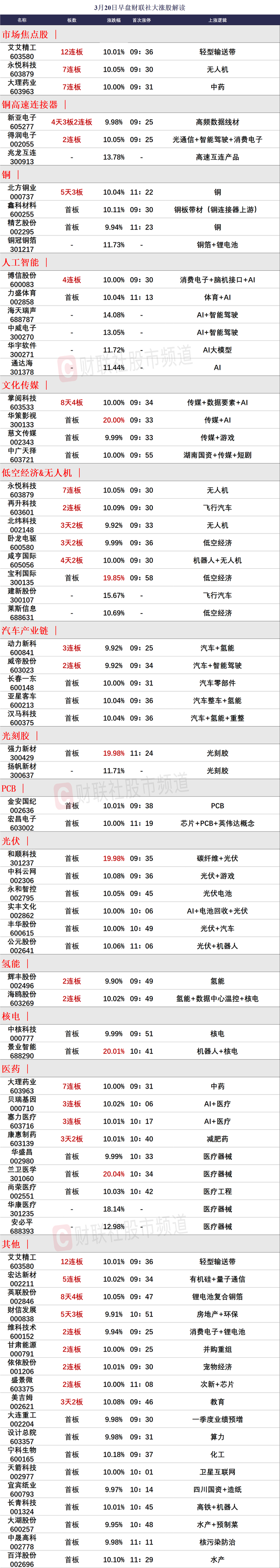 财联社3月20日讯,市场早盘震荡分化,三大指数涨跌不一,沪指偏强。盘面上,短剧、Sora概念股展开反弹,华策影视、中广天择、掌阅科技、慈文传媒涨停。铜缆高速连接器概念股开盘走强,新亚电子、得润电子涨停,兆龙互连涨超10%。AI医疗概念股盘中拉升,兰卫医学、华康医疗、贝瑞基因涨停。低空经济概念股反复活跃,永悦科技、卧龙电驱、咸亨国际涨停。有色概念股临近收盘前异动,北方铜业、精艺股份涨停。下跌方面,液冷概念股陷入调整,朗威股份跌超5%。总体上个股涨多跌少,全市场超3100只个股上涨。沪深两市半日成交额6187亿,较上个交易日缩量746亿。截至收盘,沪指涨0.45%,深成指跌0.05%,创业板指跌0.16%。北向资金方面,沪股通早盘净流入21亿,深股通早盘净流入3.11亿。