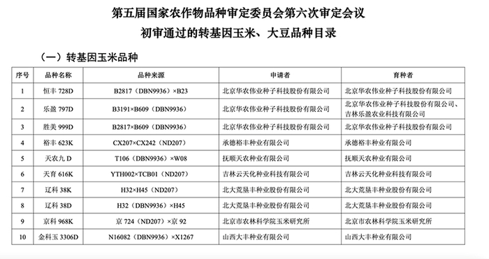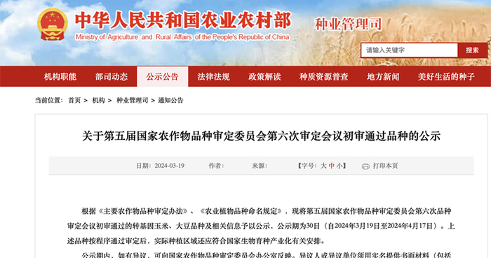 继去年12月初,我国首批51个转基因玉米、大豆品种通过审定3个多月后,3月19日,农业农村部官网发布关于第五届国家农作物品种审定委员会第六次审定会议初审通过品种的公示。27个转基因玉米品种和3个转基因大豆品种通过初审,这些品种的生产企业涉及大北农、登海种业、隆平高科、荃银高科、万向德农、垦丰种业等多家种业上市公司。