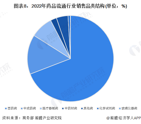 据商务部发布的《2022年药品流通行业运行统计分析报告》。按销售品类分类,西药类销售居主导地位,销售额占七大类医药商品销售总额的69.2%,其次,中成药类占14.9%,中药材类占2.3%。