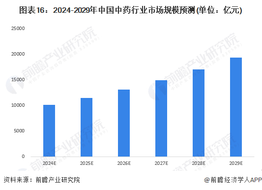 综上所述,未来中国中药行业发展潜力较大,前瞻预计2024-2029年,中国中药行业将以14%的年复合增速增长,预计2029年中国中药行业规模将达接近2万亿元。
