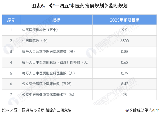 2022年3月3日,国务院办公厅发布《“十四五”中医药发展规划》,提出到2025年,中医药健康服务能力明显增强,中医药高质量发展政策和体系进一步完善,中医药振兴发展取得积极成效,在健康中国建设中的独特优势得到充分发挥。中医药产业和健康服务业高质量发展取得积极成效。中药材质量水平持续提升,供应保障能力逐步提高,中药注册管理不断优化,中药新药创制活力增强。中医药养生保健服务有序发展,中医药与相关业态持续融合发展。部分规划指标如下: