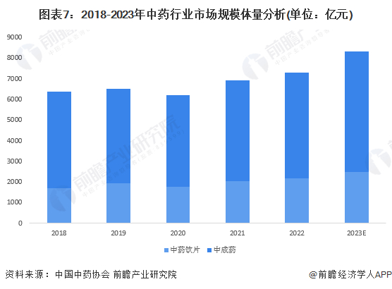中药行业中游主要是中成药及中药饮片。据中国中药协会数据,2018-2022年,我国中药行业规模整体呈波动增长态势,从2018年的6370亿元增长至2022年的超过7000亿元。据中国中药协会数据,2023年,中国75家中药上市企业营收同比增长14.3%,根据2023年中国中药市场现状,下半年或将延续上半年增速,前瞻初步测算,2023年,中国中药行业规模或将达8332亿元。