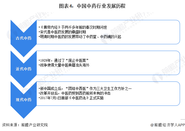 我国中药的发展史,可分为古代中药、近代中药和现代中药三个历程。近年来,国家高度重视中医药行业的发展,《中医药发展战略规划纲要(2016-2030年)》《健康中国规划纲要(2016-2030年)》和《中华人民共和国中医药法》等一系列战略政策的颁布为医药产业持续发展奠定良好的基础。此外,《关于促进中医药传承创新发展的意见》为中医药发展指明了方向。