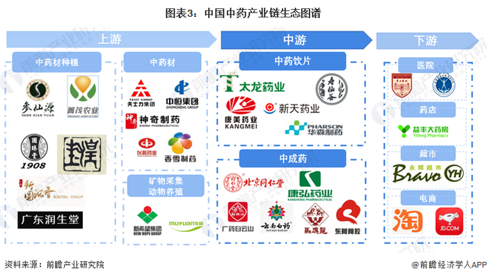中药产业链构成较为清晰。上游包括主要为中药材的提供(包括前期的矿物采集、动物养殖和中药材种植);中游包括中药饮片加工和中成药的加工;下游广泛应用于医院、药店、超市、电商等。