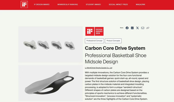 在2024年2月,李宁碳核芯助力系统获得2024年德国iF设计奖。
