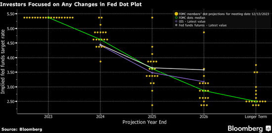 当去年12月更新点阵图时,这些点曾指向2024年降息三次——19位美联储官员对2024年底联邦基金利率的预测中值为4.6%,2025年降息四次(利率预测中值为3.6%),2026年再降息三次(利率预测中值为2.9%)。