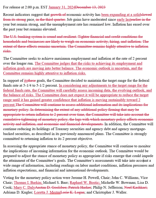 当时这份大修后的1月决议声明指出,“委员会判断实现就业和通胀目标的风险正在朝着更平衡的方向发展,在考虑对联邦基金利率目标区间进行任何调整时,委员会将仔细评估即将公布的数据、不断变化的前景以及风险平衡情况。”
