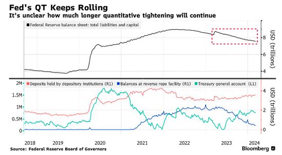 Bleakley Financial Group首席投资官Peter Boockvar在给客户的一份说明中写道,“我们正在接近一个点,即QT开始超过美联储逆回购工具的降幅,流动性因此开始流失。现在,这(放缓缩表的讨论)将比美联储今年是降息一次、两次、三次乃至完全不降息更为关键。”