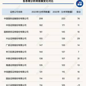 截至3月17日,最新数据显示,共有14家券商分析师人数超过100人。其中,中金公司以320人居首;紧随其后的是中信证券、国泰君安,分别有182人和162人。每经记者注意到,在这“百人团”中,不乏一些知名的中型券商,如兴业证券(157人)、国金证券(118人)、浙商证券(118人)和长江证券(117人)。