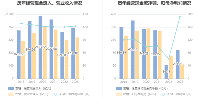 2023年,公司经营活动现金流净额为201.06亿元,同比增长108.36%;筹资活动现金流净额-54.36亿元,同比增加2.87亿元;投资活动现金流净额-193.07亿元,上年同期为-52.81亿元。