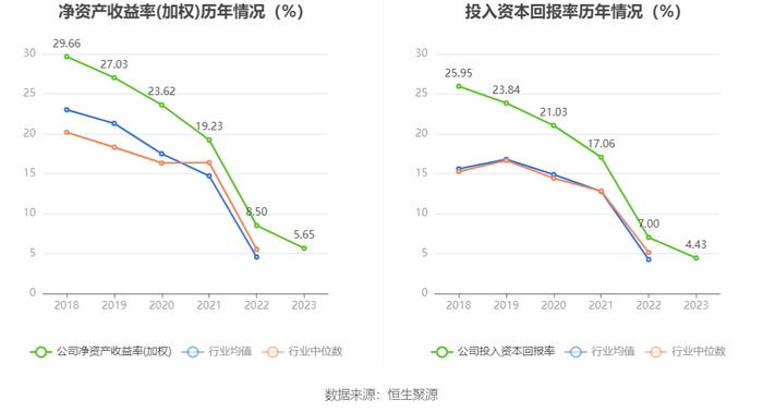 数据显示,2023年公司加权平均净资产收益率为5.65%,较上年同期下降2.85个百分点;公司2023年投入资本回报率为4.43%,较上年同期下降2.57个百分点。