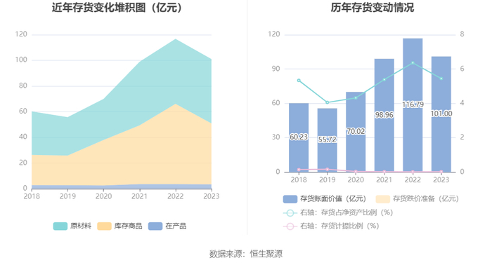 从存货变动来看,截至2023年年末,公司存货账面价值为101.0亿元,占净资产的5.45%,较上年末减少15.79亿元。其中,存货跌价准备为256.09万元,计提比例为0.03%。