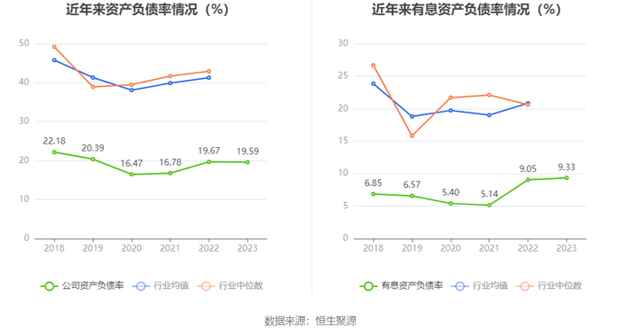在偿债能力方面,公司2023年年末资产负债率为19.59%,相比上年末下降0.08个百分点;有息资产负债率为9.33%,相比上年末上升0.28个百分点。