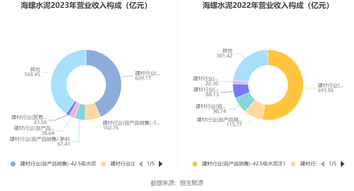 分产品看,建材行业(自产品销售)-42.5级水泥、建材行业(自产品销售)-32.5级水泥、建材行业(自产品销售)-熟料2023年毛利率分别为25.23%、30.33%、15.06%。