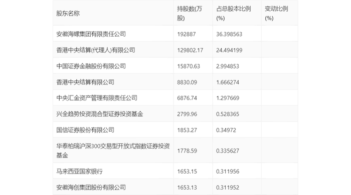 年报显示,2023年年末公司十大流通股东中,持股最多的为安徽海螺集团有限责任公司,占比36.40%。十大流通股东名单相比2023年三季报维持不变。在具体持股比例上,国信证券股份有限公司、华泰柏瑞沪深300交易型开放式指数证券投资基金持股有所上升,香港中央结算(代理人)有限公司、香港中央结算有限公司持股有所下降。