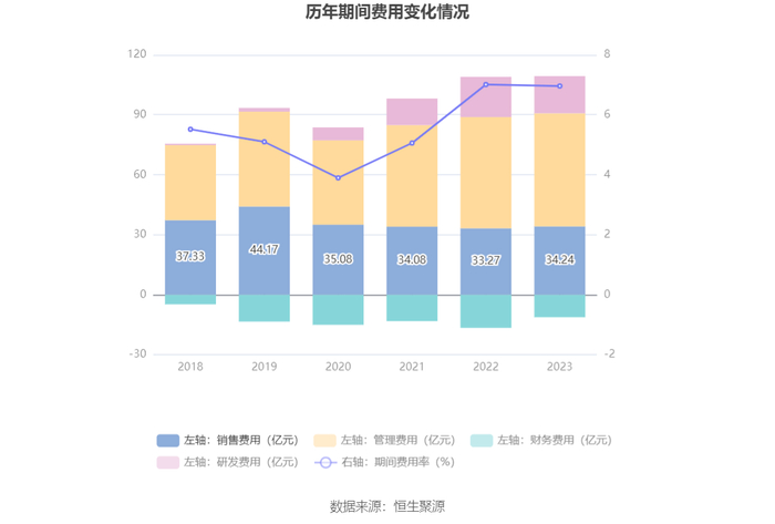 2023年,公司期间费用为98.16亿元,较上年同期增加5.67亿元;但期间费用率为6.96%,较上年同期下降0.05个百分点。其中,销售费用同比增长2.89%,管理费用同比增长1.62%,研发费用同比下降7.55%,财务费用由去年同期的-16.51亿元变为-11.19亿元。