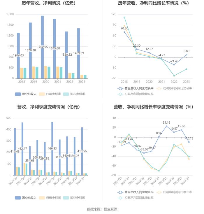 2023年,公司毛利率为16.57%,同比下降4.73个百分点;净利率为7.62%,较上年同期下降4.61个百分点。从单季度指标来看,2023年第四季度公司毛利率为12.42%,同比下降1.46个百分点,环比下降3.76个百分点;净利率为3.99%,较上年同期下降3.25个百分点,较上一季度下降2.75个百分点。