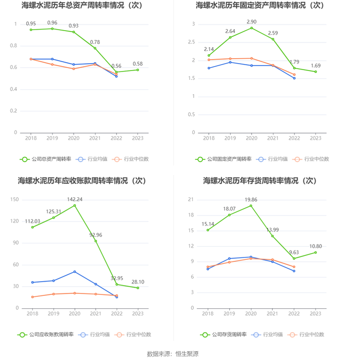 营运能力方面,2023年,公司公司总资产周转率为0.58次,上年同期为0.56次(2022年行业平均值为0.52次,公司位居同行业8/16);固定资产周转率为1.69次,上年同期为1.79次(2022年行业平均值为1.51次,公司位居同行业6/16);公司应收账款周转率、存货周转率分别为28.10次、10.80次。