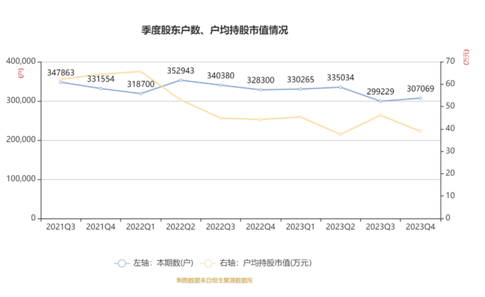 筹码集中度方面,截至2023年末,公司股东总户数为30.71万户,较三季度末增长了7840户,增幅2.62%;户均持股市值由三季度末的46.1万元下降至38.93万元,降幅为15.54%。