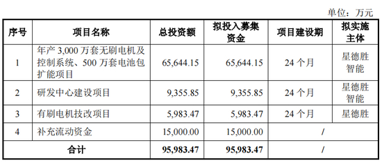 据招股书显示,星德胜拟募集资金95,983.47万元,主要用于“年产3,000万套无刷电机及控制系统、500万套电池包扩能项目”、“研发中心建设项目”、“有刷电机技改项目”及“补充流动资金”。